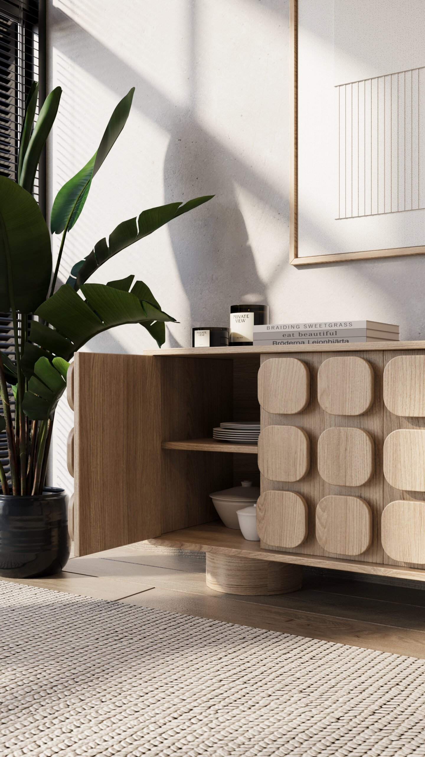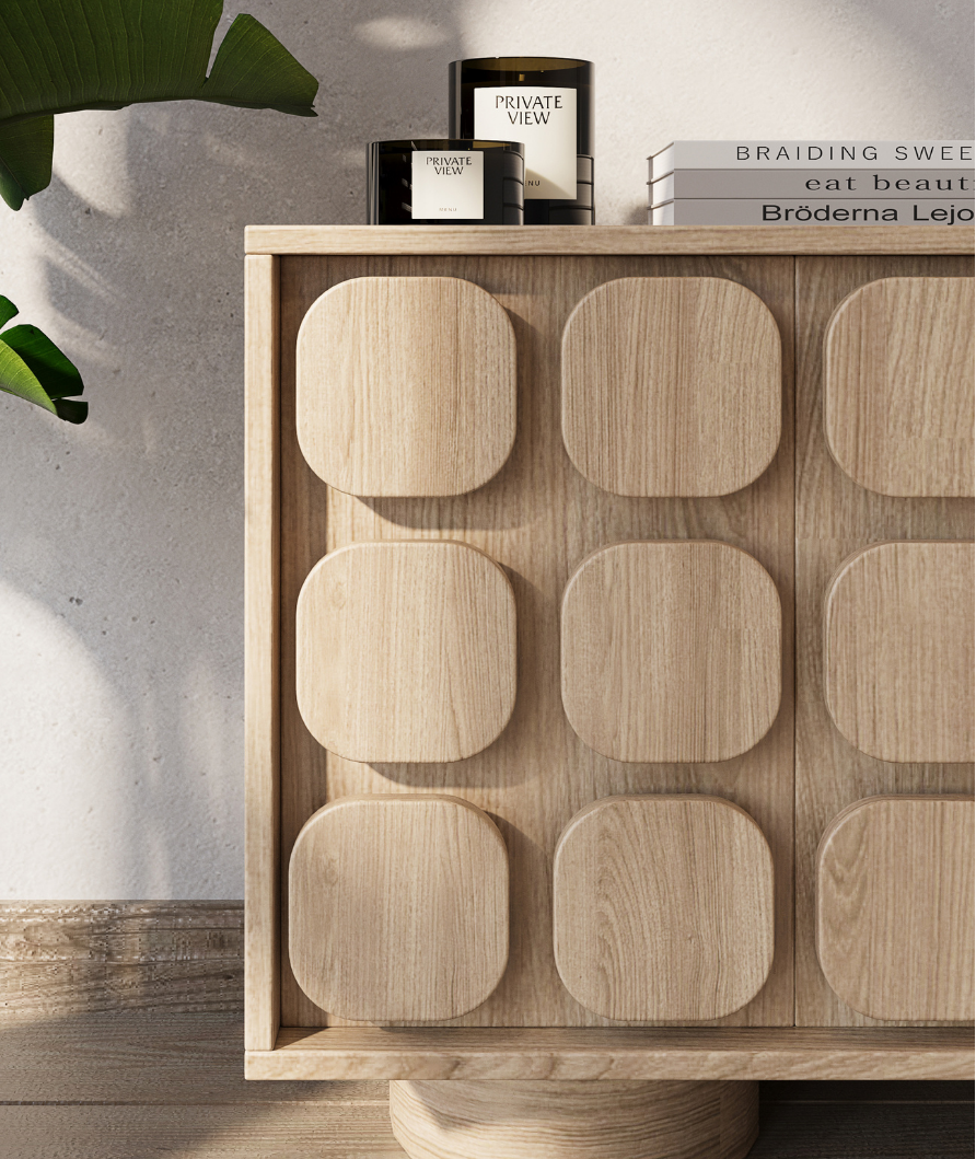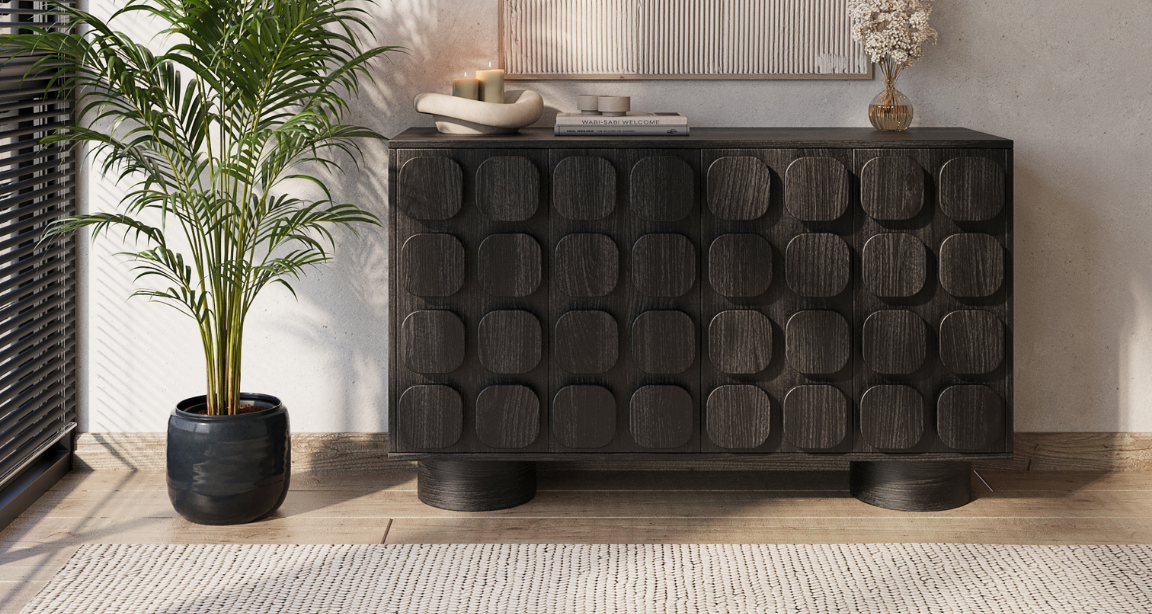 El Vajillero Noir se destaca por su fuerte impronta estética y su diseño escultórico. Sus frentes con relieve geométrico, compuestos por módulos de esquinas redondeadas, generan un juego de luces y sombras que aporta profundidad y personalidad a la pieza.