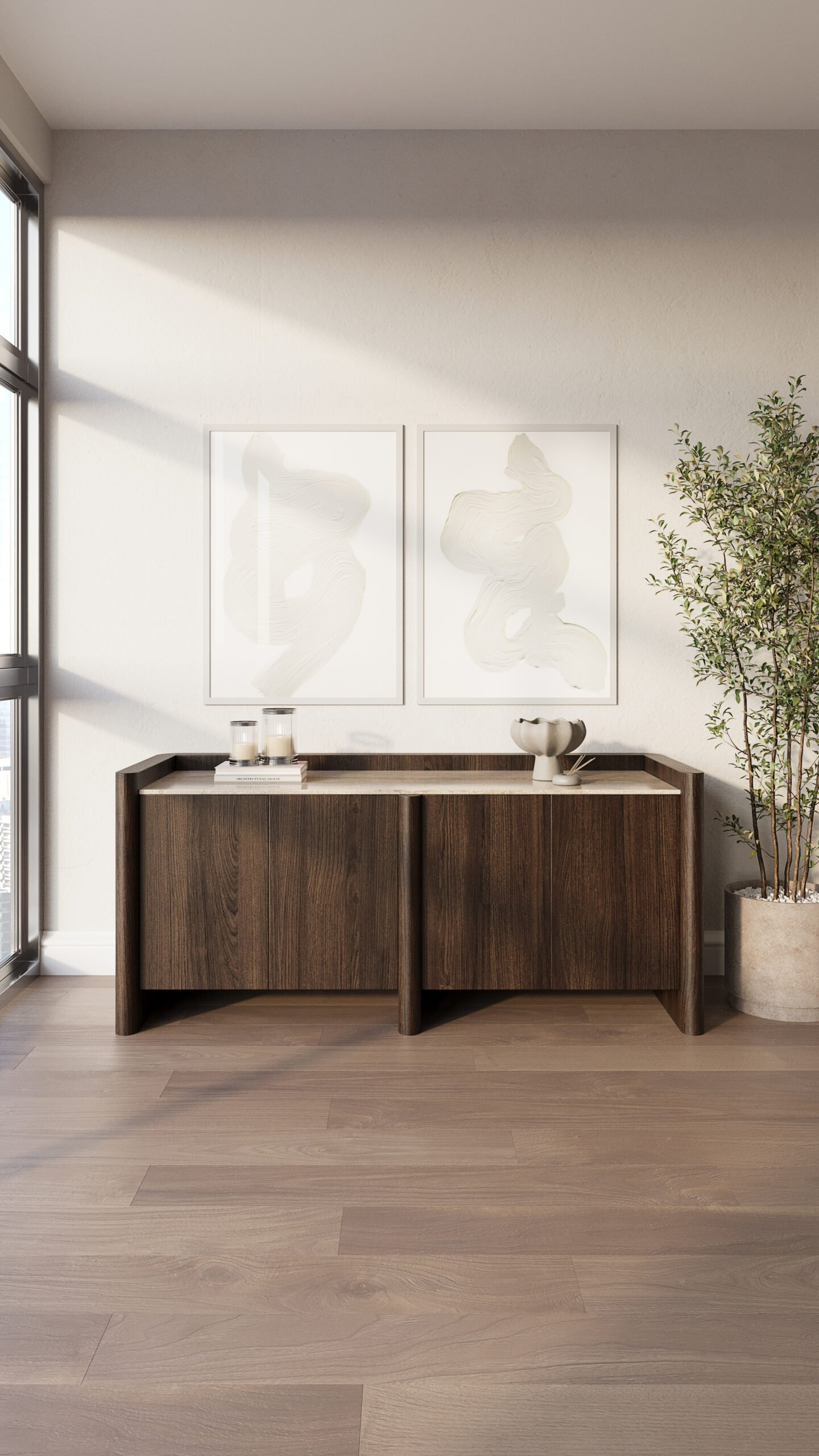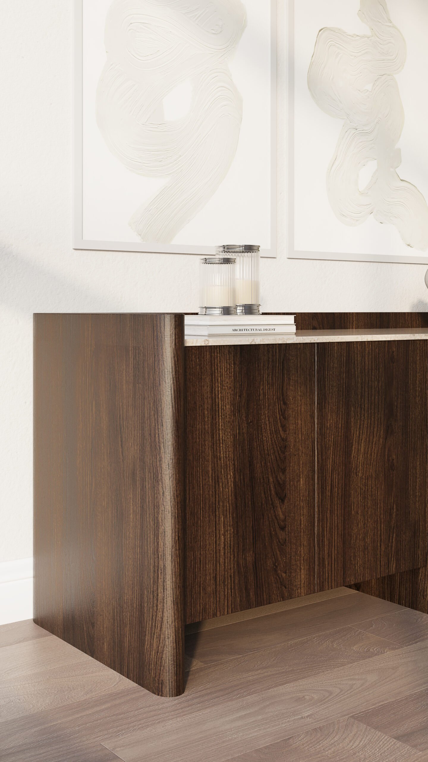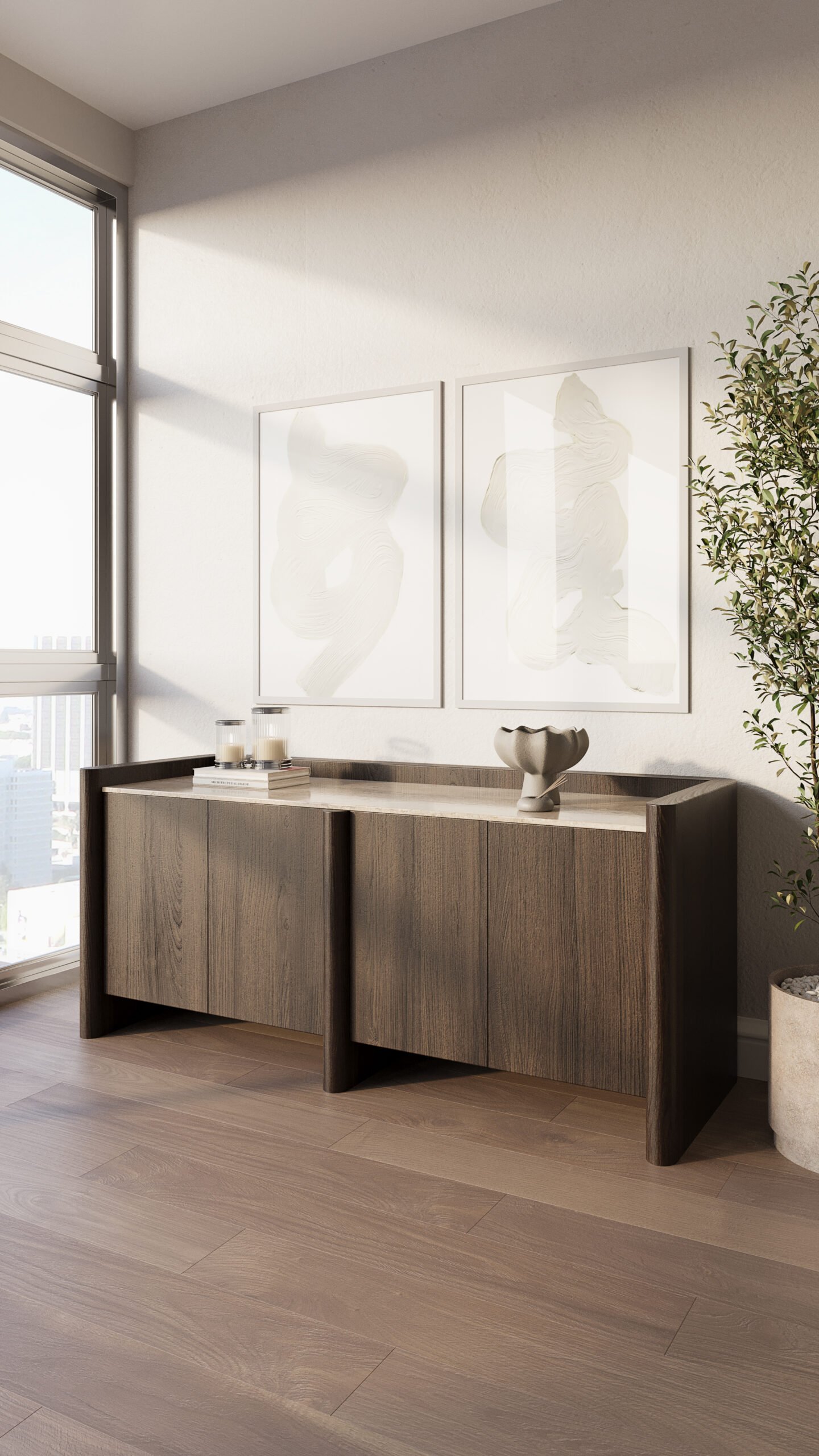 El vajillero Valden combina la calidez natural de la madera con la sofisticación atemporal del travertino, logrando una pieza equilibrada y de fuerte presencia estética. Sus líneas rectas y proporciones sólidas se suavizan con laterales curvos que enmarcan el diseño y le aportan carácter.